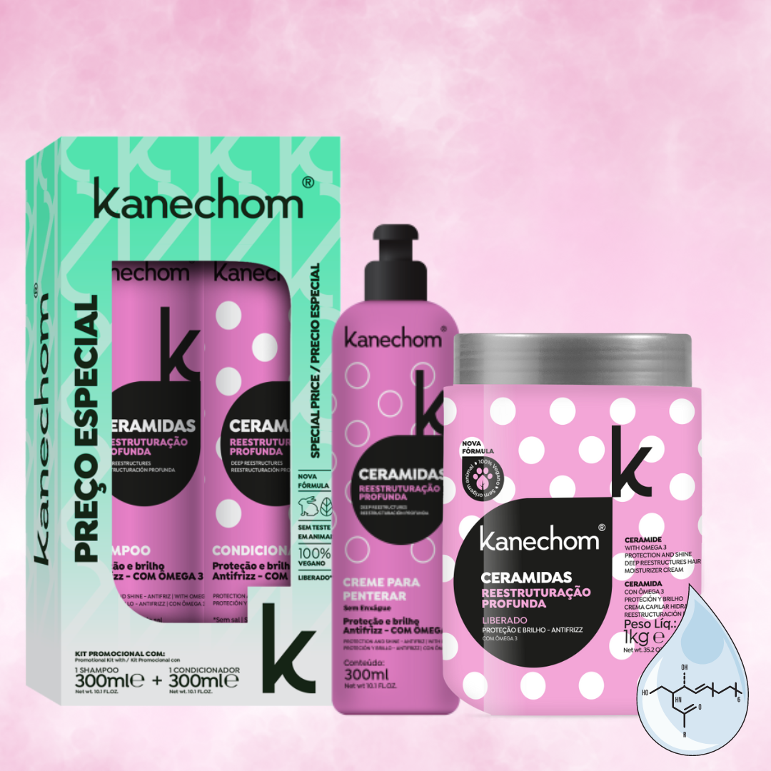 La gamme Kanechom Ceramidas contient dans sa formulation une combinaison spéciale de céramides et d'oméga 3, qui, ensemble, favorisent un traitement complet de restructuration de la fibre capillaire endommagées, offrant conditionnement, douceur et force.