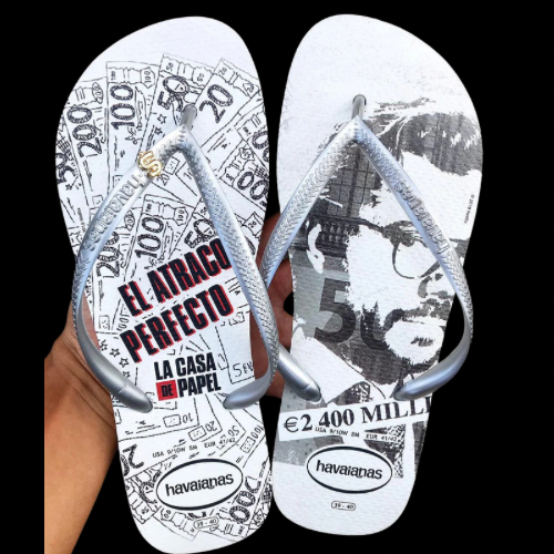 Inspirée de la série culte La Casa de Papel, cette paire Havaianas rend hommage au “Professeur” et à son plan légendaire. Design noir & blanc, billets en motif et slogan iconique “El atraco perfecto” : tout est là pour incarner l’esprit rebelle et stratégique de la série.
